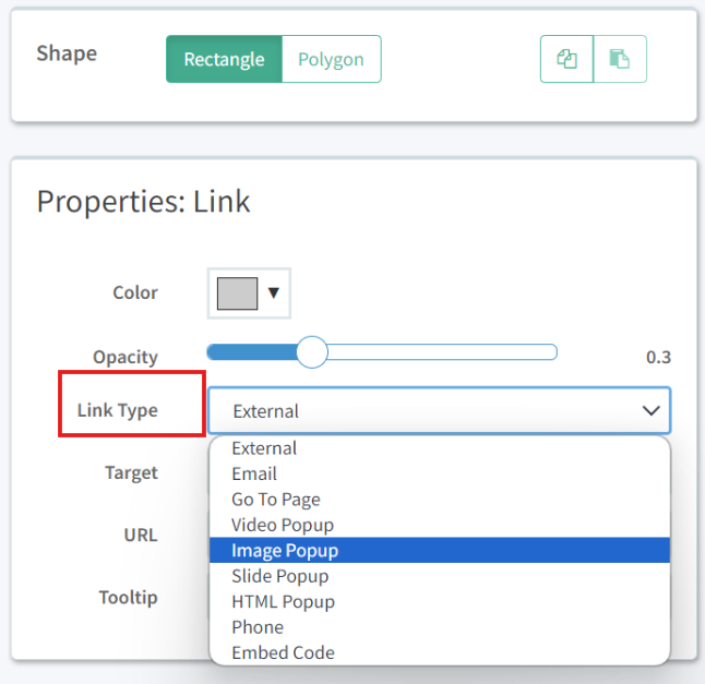 3. On the right-hand side, use the shape button to create the shape around the image where you would like the pop up to go