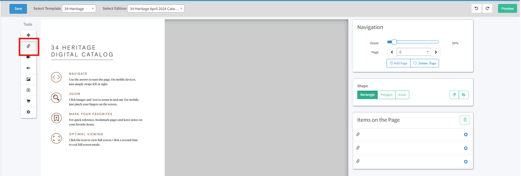 2. Under the tool section click on the link icon and place a link anywhere on the page