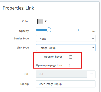 You also have the following options on how you'd like to activate the pop up image: Open on hover and Open upon page turn.