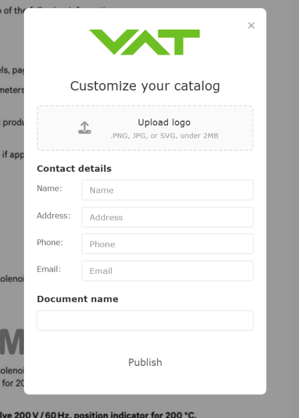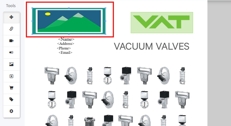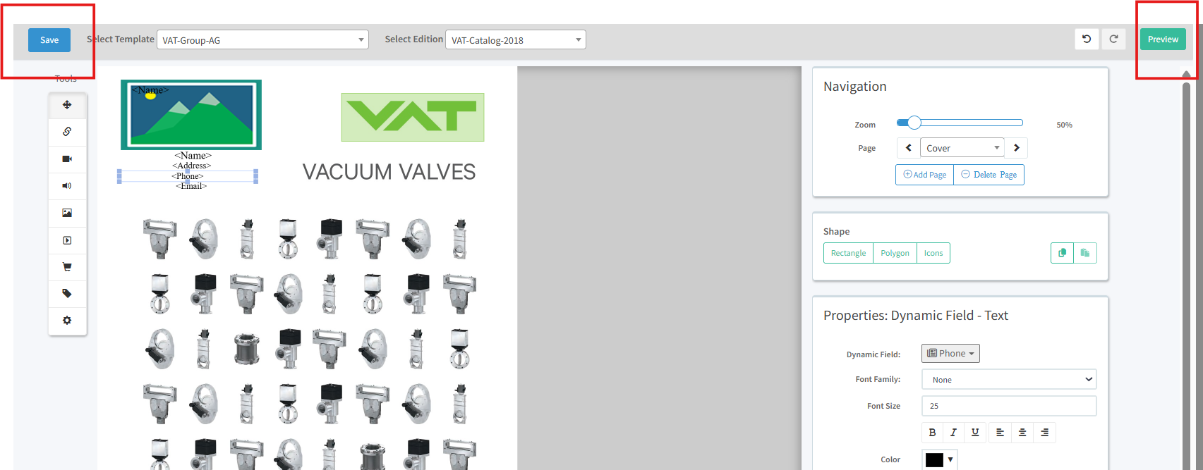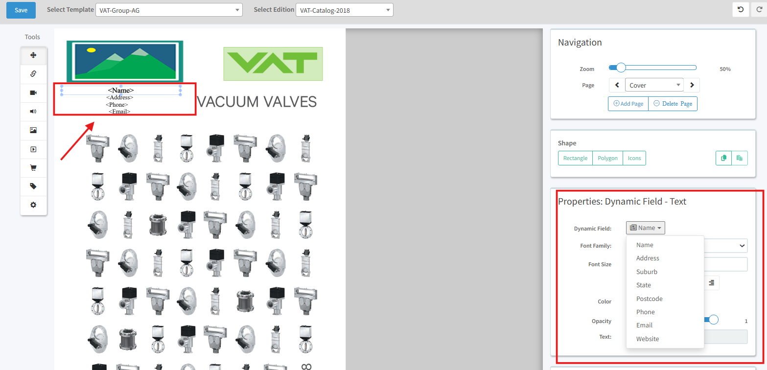 These will automatically populate designated areas on your catalog. The fields used (logo, name, email, etc.) must be configured during template setup. If you're not seeing these options, contact support to enable them or follow the steps above on how to add dynamic fields.