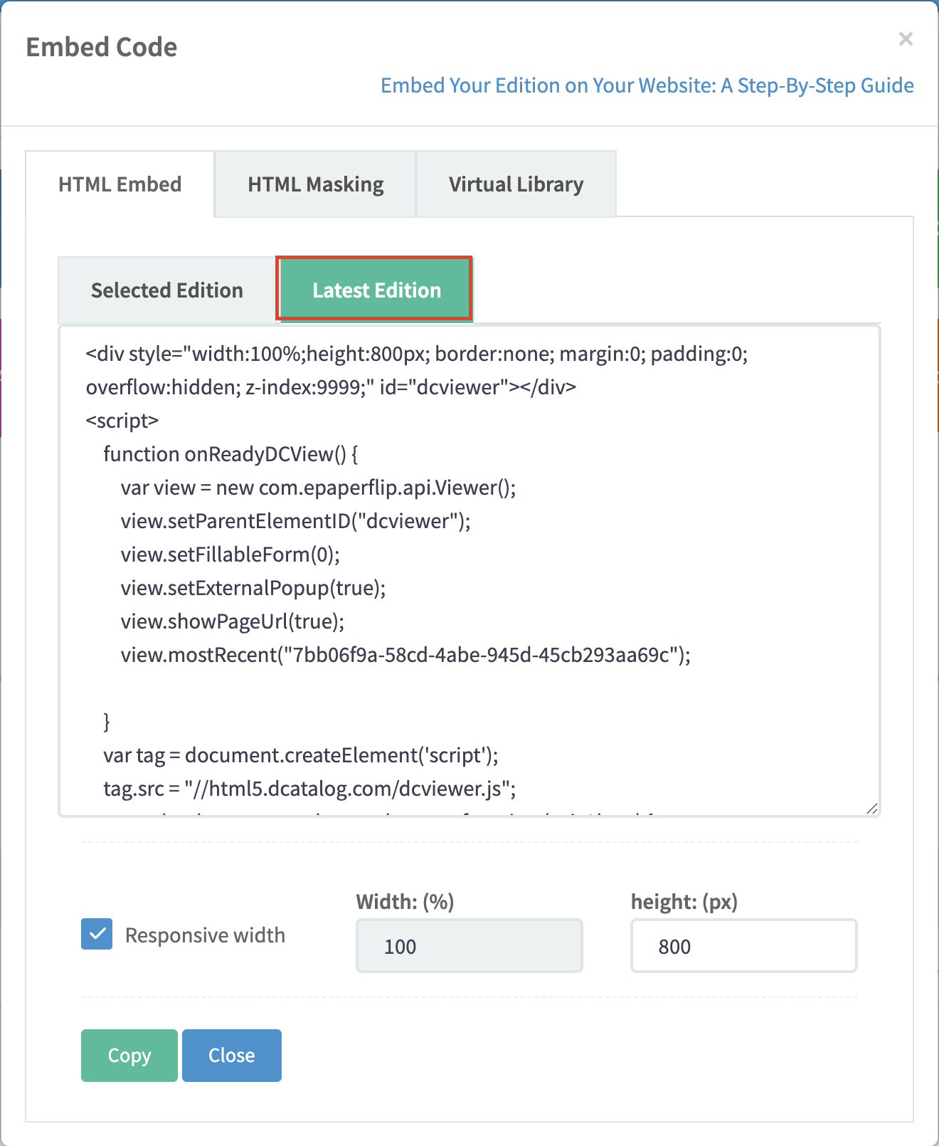 - Latest Edition — Always shows the most recently published edition from your template, without requiring any updates to your code.
