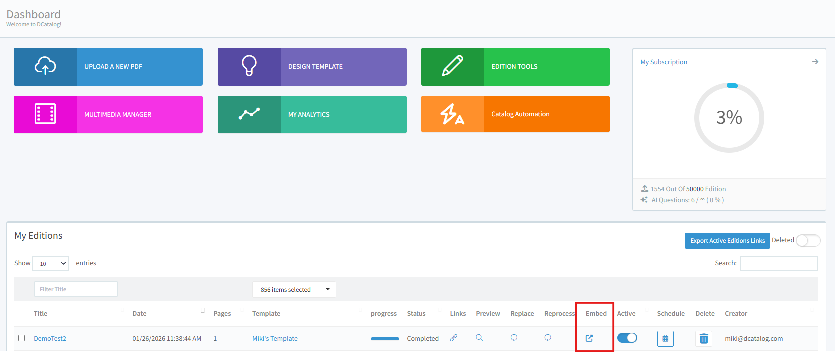Log in to your DCatalog account. Click on the “Embed” button for the catalog you want to use.