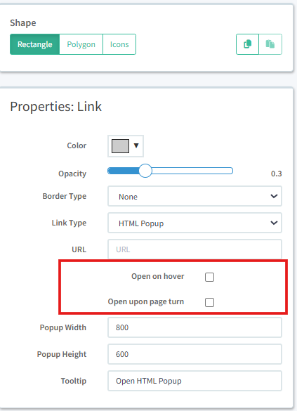 You also have the following options on how you'd like to activate the pop up image: Open on hover and Open upon page turn.