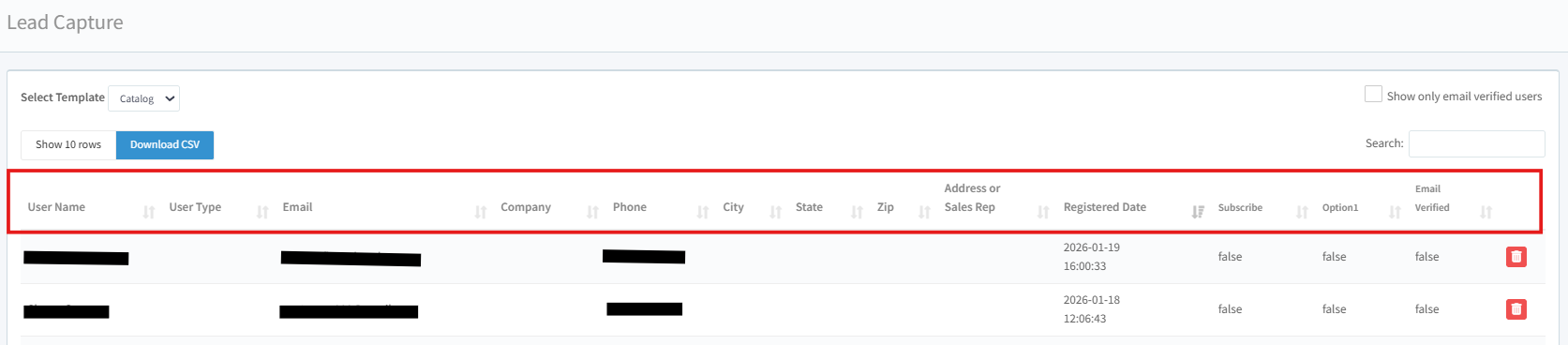 You will be presented with the captured data like; User Name, Email address, Phone, Registered Date, and if the Email is Verified.