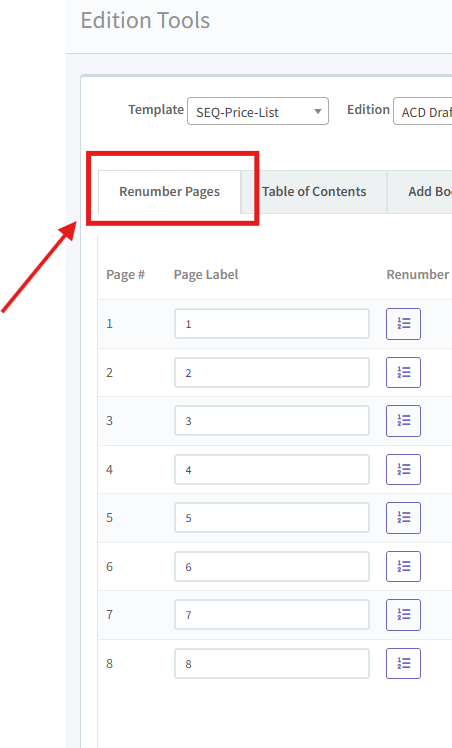 The Renumber Pages tool allows you to label pages according to the digital edition. For example, Page 1 may start on Page 3 so you will need to number the pages accordingly.